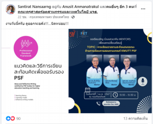 • เมื่อวันที่ 1 เมษายน พ.ศ. 2567 ผศ.ดร.อนุศิษฏ์ อันมานะตระกูล รศ.ดร.สันติรัฐ นันสะอาง และผม ได้รับโอกาสให้เป็นวิทยากรการเขียนสะท้อนคิดเพื่อขอรับรอง PSF ด้านการเรียนการสอนให้กับคณาจารย์ในคณะครุศาสตร์อุตสาหกรรมและเทคโนโลยี (FIET)